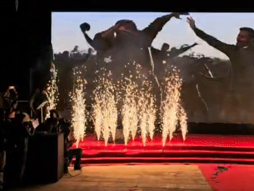 मंदिर के सामने बने एम्फीथिएटर में सनी देओल, वरुण धवन, अहान शेट्टी और सोनू निगम की मौजूदगी में गीत की लाइव प्रस्तुति दी गई।